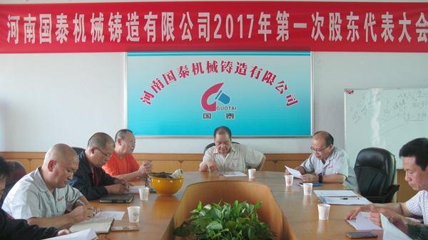 公司2017年第一次股東代表大會于2017年8月3日在公司三樓小會議室召開,會議由河南國泰機械鑄造有限公司董事會召集。股東方代表濟鋼常務副總經理周為民及其他14名股東代表出席了會議,3人因事缺席,會議的召集、召開形式和程序符合《中華人民共和國公司法》和《河南國泰機械鑄造有限公司章程》的有關規(guī)定,會議合法有效。